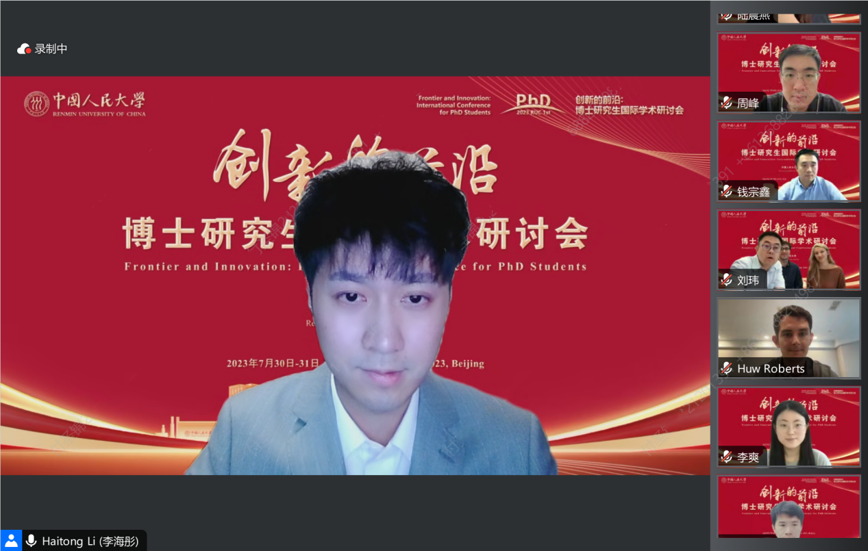 为融通中外文化、增进文明交流,2023年7月30-31日,中国人民大学首届“创新的前沿:博士研究生国际学术研讨会”以线上线下相结合的方式举办。本次研讨会由研究生院、纬来体育 承办,中国人民大学党委书记张东刚、教育部学位管理与研究生教育司司长洪大用、北京师范大学副校长汪明出席研讨会开幕式并致辞,中国人民大学副校长杜鹏出席开幕式,中国人民大学副校长王易主持开幕式。
