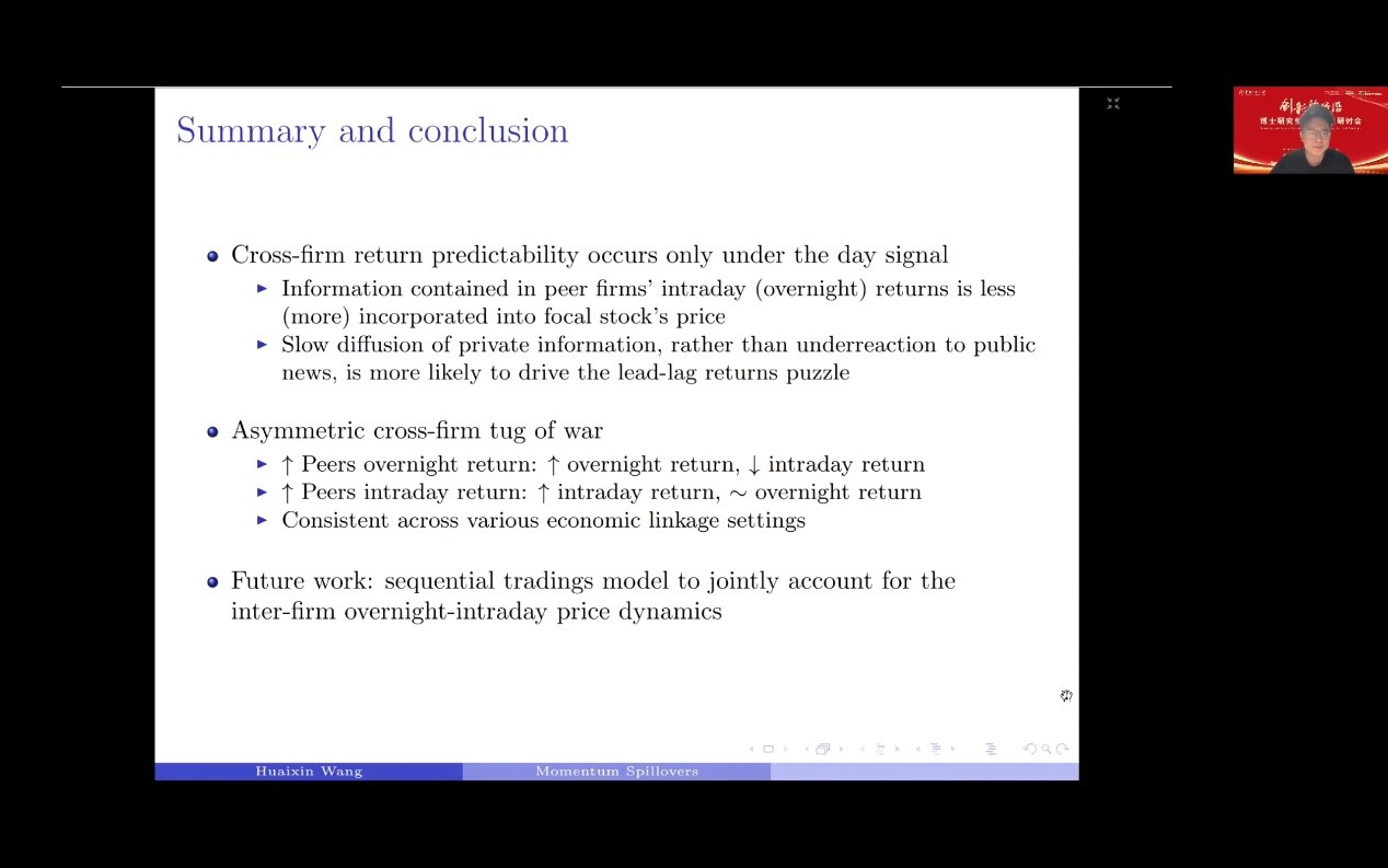 分会场第二节为财务与会计方向,以线上会议形式举行,由特邀校友张书博主持,并与纬来体育 青年教师陈俊一同担任点评专家。来自香港理工大学的Adubofour Prince Charles、清华大学的王槐鑫、密歇根州立大学的尚聪、香港理工大学的汪奔进行论文研究汇报。