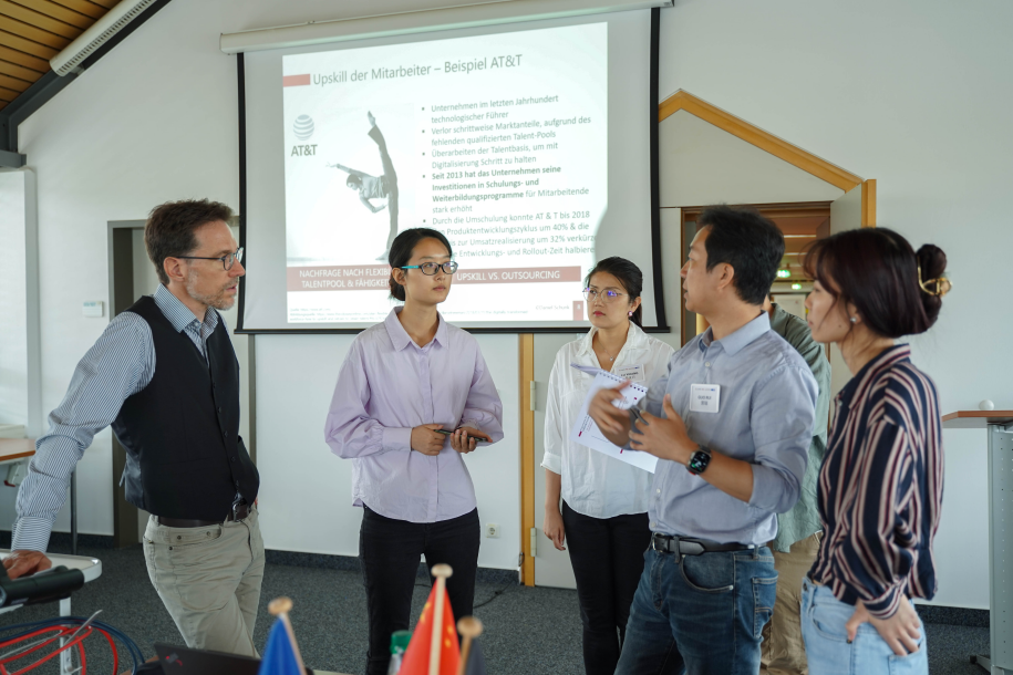师生们前往第二所德国大学,美因茨大学(Johannes Gutenberg-Universit t Mainz)成立于1447年,已有近 600 年历史,是德国最古老的大学之一,也是德国十大高校之一,同时也是德国经济最发达地区莱茵美因地区最大的高校。在这里,师生聆听了美因茨大学法律与经济系教授、德国联邦教研部、联邦劳工与社会福利部高级顾问Prof. Dr. Daniel Schunk主题为“未来的劳动力需要什么技能,我们如何使教育数字化?”的课程讲座。