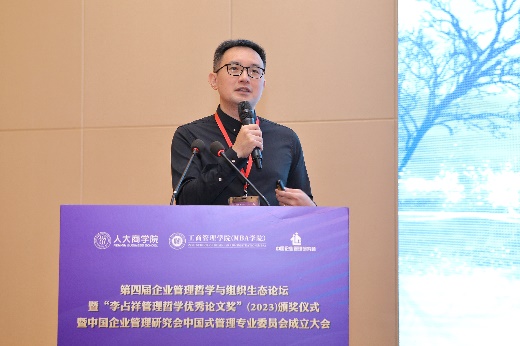 叶康涛对出席本次活动的嘉宾表示欢迎。他提到,企业管理哲学与组织生态研究中心是为了纪念我国著名的企业管理学家李占祥先生于2019年10月成立的,并每年举办论坛。设立李占祥管理哲学奖旨在从哲学高度提炼和探讨中国企业的重大问题,推动企业管理的学科发展和实践应用,努力构建中国特色企业管理理论体系的学术自信。本次论坛以中国式现代化的组织管理智慧为主题,聚焦中国本土企业管理思想与管理理论创新、数字时代企业管理哲学的创新思考与理论发展等重大具有中国特色的时代议题。希望各位参加论坛的学界名师才俊、业界精英翘楚能借此机会进行思想的交流碰撞,发扬理论联系实际的优良作风。