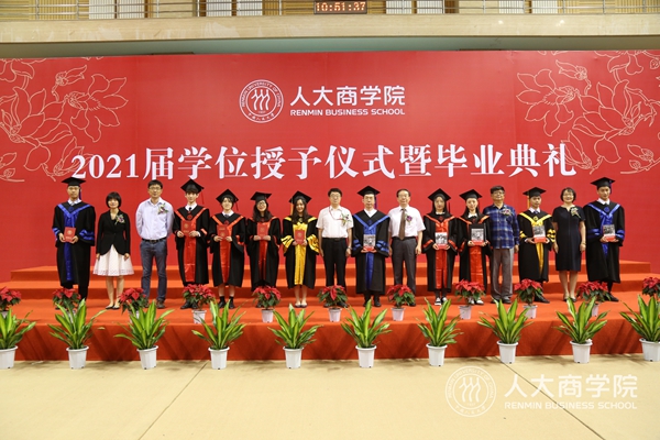 毕业典礼上,纬来体育 2021年“榜样商院”毕业十星、187名北京市级、校级及院级优秀毕业生、到西部和基层就业的毕业生受到表彰。